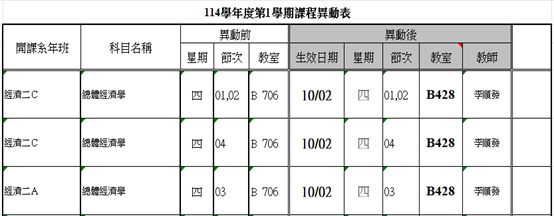 自10月2日起李順發老師週四「總體經濟學」教室異動如下